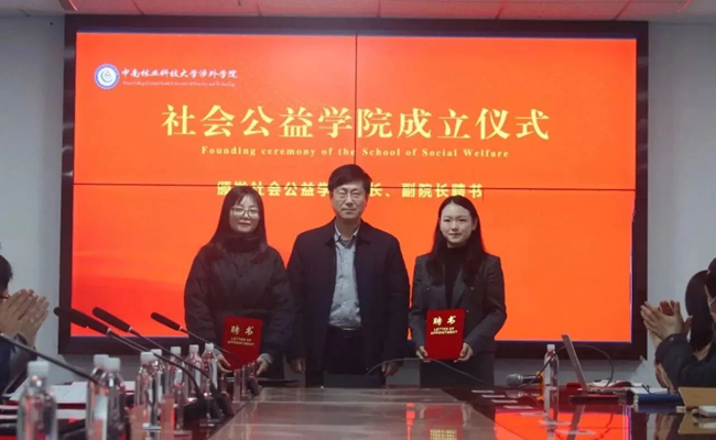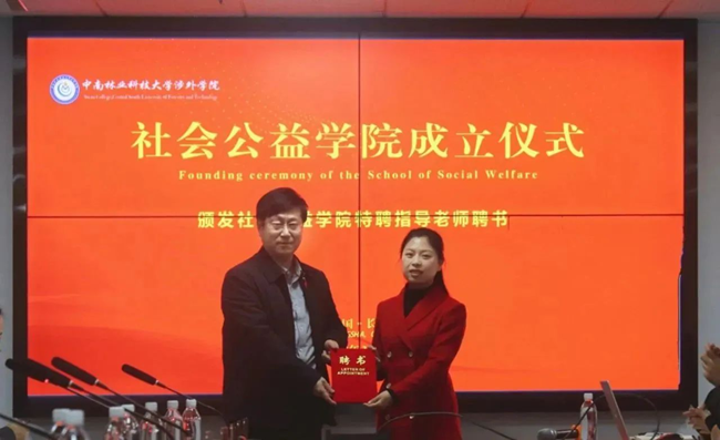 2023白菜网总站大全600cc全讯白菜自助注册院长周志宏为中南林600cc全讯白菜自助注册院长助理、社会公益学院院长王佳怡、中南林600cc全讯白菜自助注册学工处副处长、团委书记、社会公益学院副院长齐程程颁发聘书。