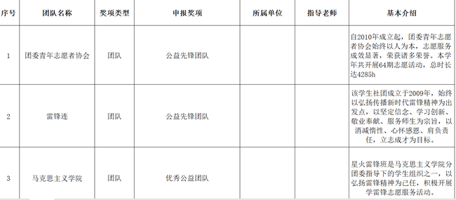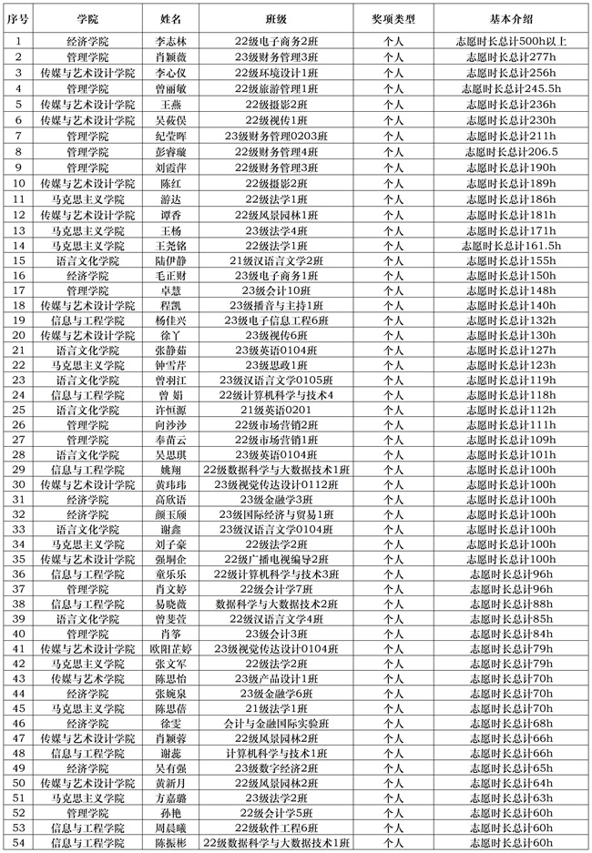根据学校2023-2024年度“星辰·公益”荣誉称号评选工作的安排,截止2024年9月9日,校内评审环节已圆满结束。经学生自主报名、辅导员(部门)及二级学院分团委审核推荐,团委终审,2023-2024年度“星辰·公益”荣誉称号评审综合结果,由申报材料量化评价、社会公益学院终评评审两部分构成。现将评审结果公示如下: