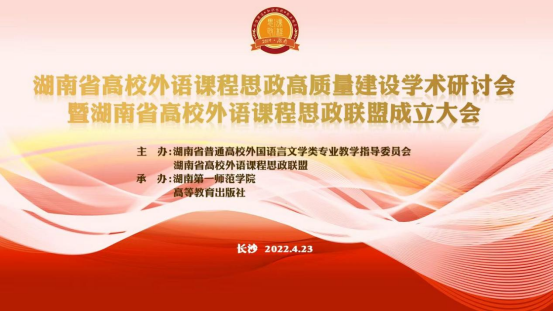 4月23日,湖南省高校外语课程思政高质量建设学术研讨会暨湖南省高校外语课程思政联盟成立大会在长沙召开。会议由湖南省普通高校外国语言文学类专业教学指导委员会、湖南省高校外语课程思政联盟主办,湖南第一师范学院、高等教育出版社承办。语言文化学院院长彭爱和、大学英语教研室主任李万红出席会议。