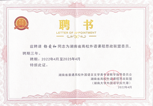 会上,白菜官网被授予“湖南省普通高等学校外语课程思政示范基地”称号,语言文化学院院长彭爱和被聘为联盟委员。