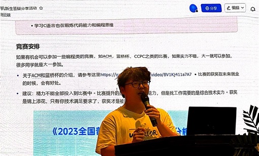ATD计算机协会会长王建同学,分享了他在学习、竞赛和实习等方面的经验。王同学向所有新生发出了入会邀请,期待能与学弟学妹们一起学习、共同成长。